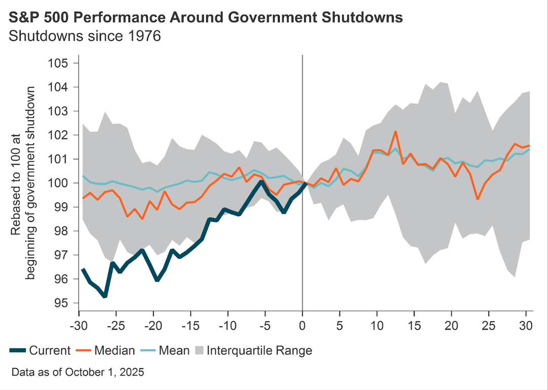 1. Stay calm during shutdown headlines. History points to a consistent pattern of recovery. Markets often rise both during and after shutdowns. Sharp declines tend to present opportunity, not danger.
