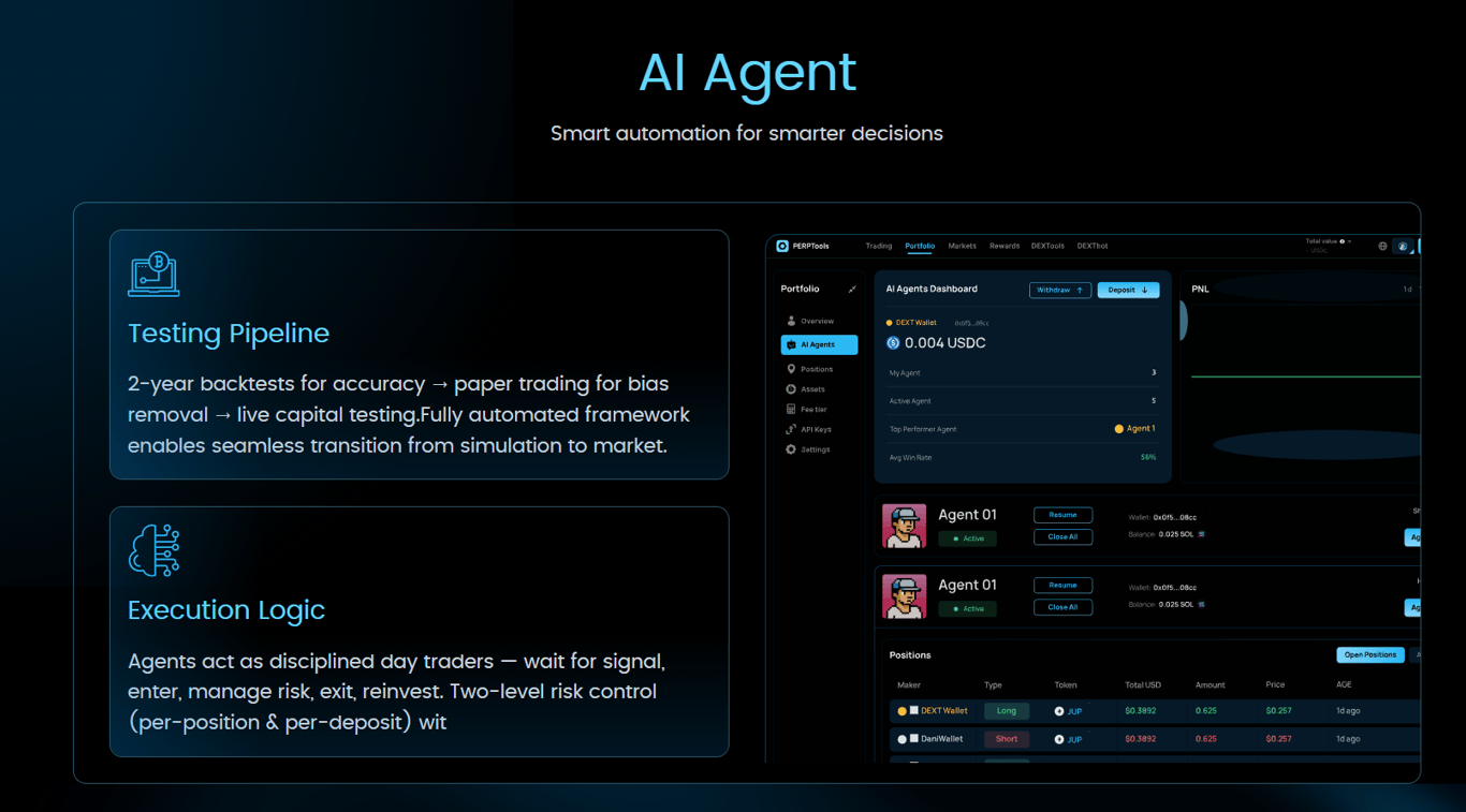 AI agents provide execution speed, and PERPTools defines the operating framework. Together they enable controlled scaling across leveraged perpetual markets.