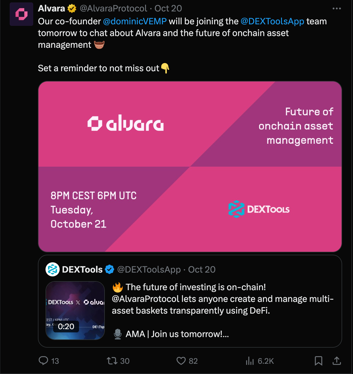 The AMA highlighted the broader significance of multi-asset baskets in DeFi. Transparency, modularity, and permissionless access are core to Alvara’s design, enabling wider participation in basket management and opening new avenues for analytics integration with DEXTools. Tokenized baskets facilitate deeper insights into performance, liquidity, and market trends while offering users diversified exposure in a single, tradable asset.