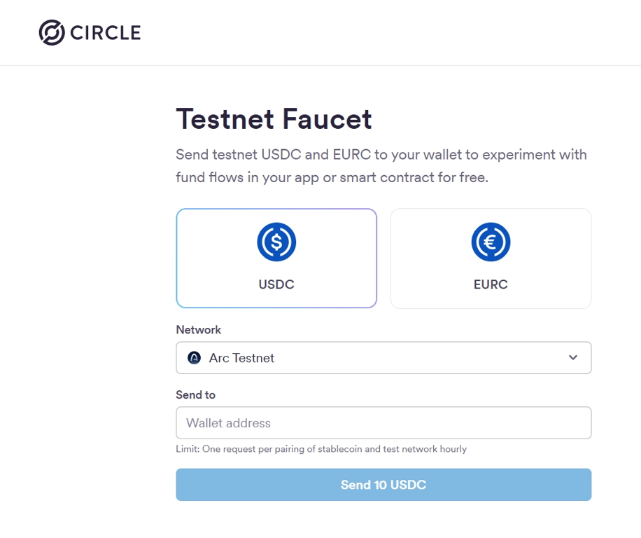 Visit the faucet at faucet.circle.com, enter your wallet address, and click "Send 10 USDC/EURC" to receive testnet tokens for platform experimentation.