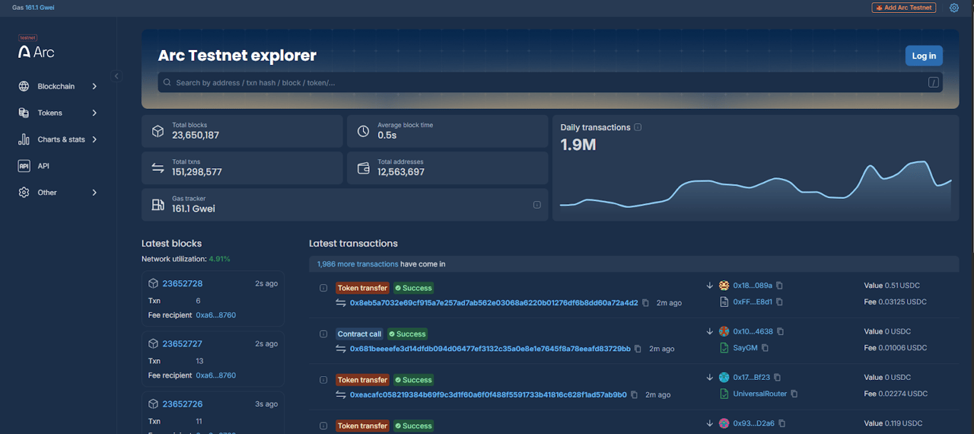 Access testnet.arcscan.app and perform the following activities: