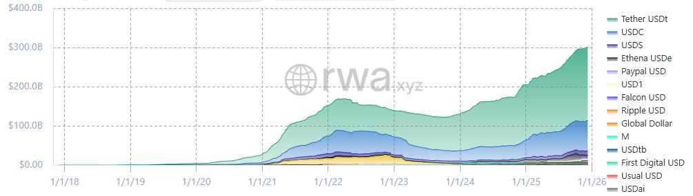 Australia’s updated rules come at a time when stablecoins are seeing massive adoption worldwide. Data from RWA.xyz shows the total stablecoin market cap has reached a new record of over $300 billion. This marks a 48% increase since the start of 2025.