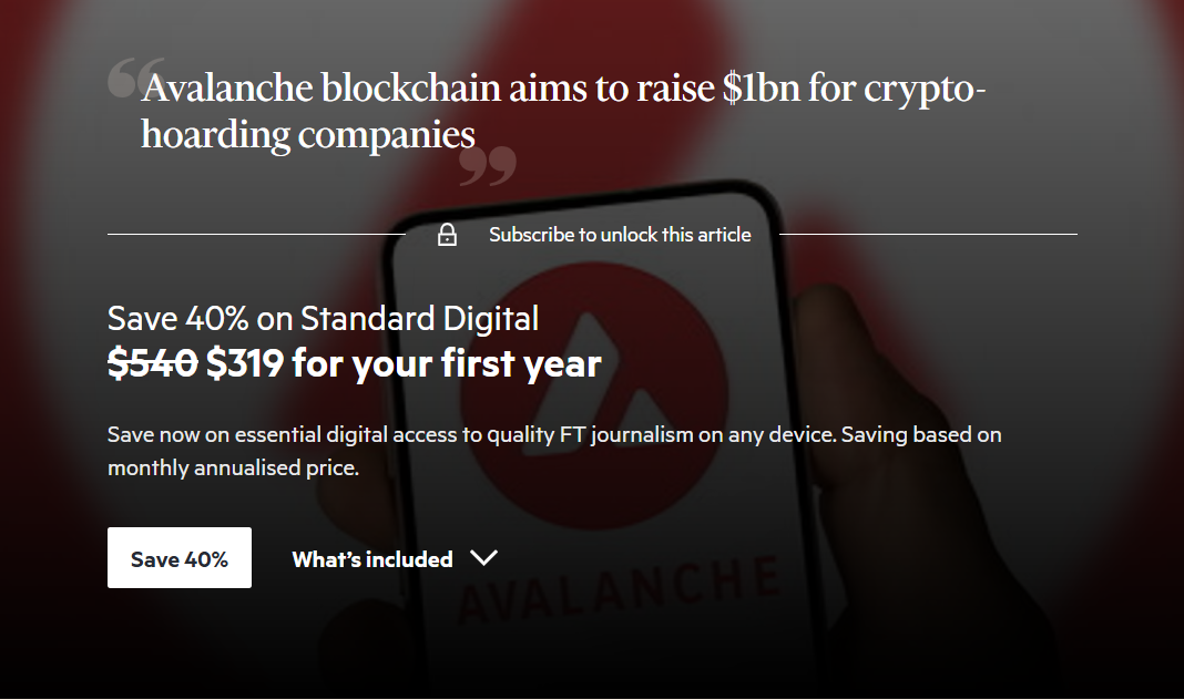 According to the FT, the Avalanche Foundation—the nonprofit group overseeing the Avalanche blockchain—is in talks to raise up to $1 billion to fund two new crypto treasury companies. Both entities would be structured to hold millions of AVAX tokens, with investors buying tokens directly from the foundation at a discounted rate.