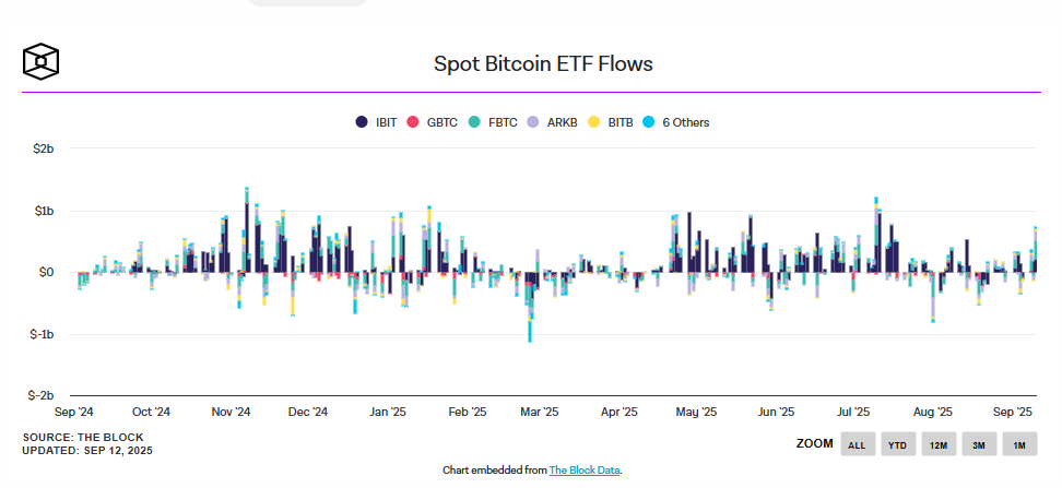 Just last month, spot bitcoin ETFs suffered $751 million in outflows, their third-worst month since debuting in January. That coincided with Ethereum ETFs drawing a record $3.87 billion, fueling a BTC-to-ETH rotation narrative and driving Bitcoin to around $107,500 by August’s end.