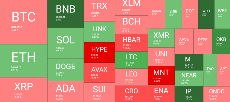Over the weekend, Bitcoin’s price drifted downward after attempting to clear the $116,000 level. Earlier in the week it had surged from under $115,000 to nearly $117,000, but was rejected and has since slipped, now fluctuating between $115,000 and $116,000.