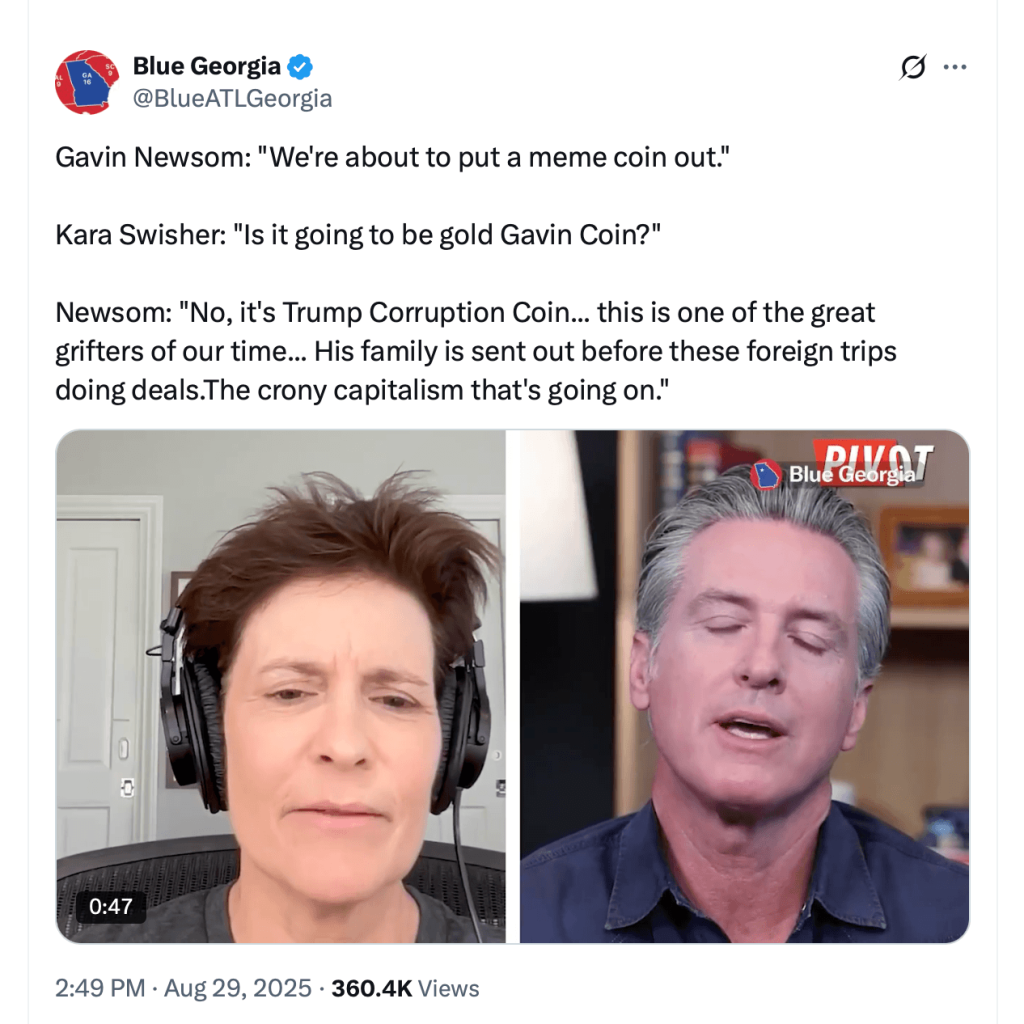 - Gavin Newsom plans to launch a satirical “Trump Corruption Coin.”