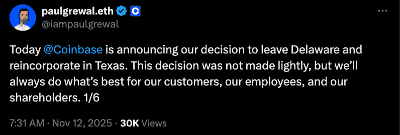 - Coinbase will move its incorporation from Delaware to Texas, highlighting differences in legal predictability between the two states