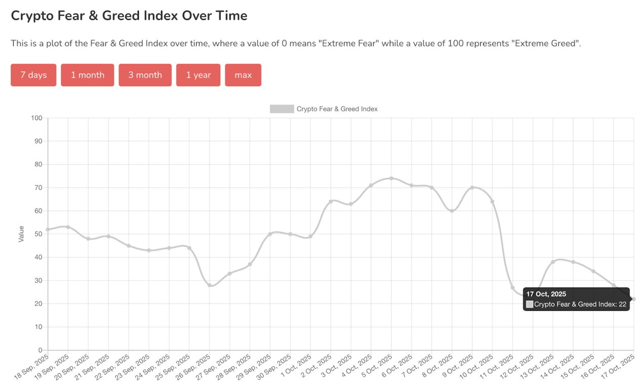 At the start of October, the Crypto Fear & Greed Index stood at 74, showing strong confidence. A few days later, after the liquidation cascade, it dropped to 22. The fall was steep and relentless. Over the following weeks, sentiment continued to sink: 18 by October 25 and 15 by the end of the month, the lowest level since the 2020 pandemic crash. Even in early November, the index stayed near 20 to 25, signaling deep hesitation.