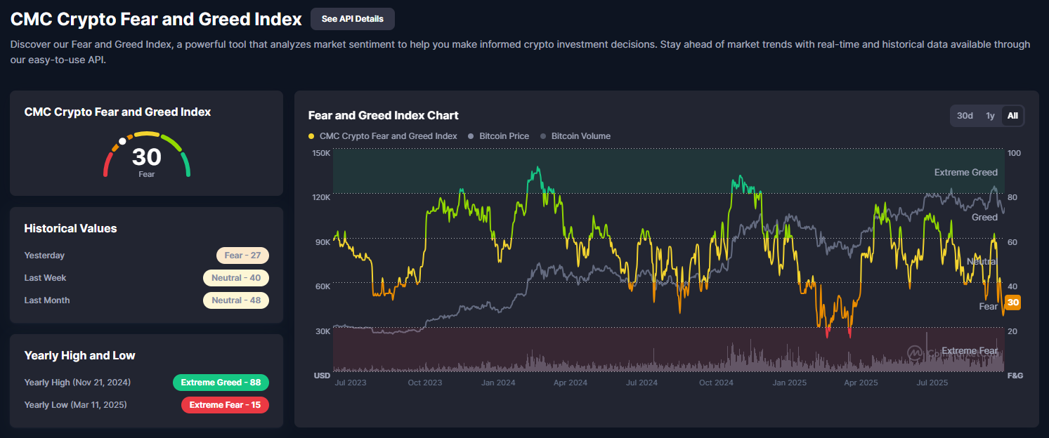 Market sentiment is still cautious. The Fear and Greed Index stands at 30, reflecting ongoing unease after the tariff shock. Meanwhile, the Altcoin Season Index at 26 shows a temporary shift of capital toward Bitcoin as investors prioritize safety. Historically, these conditions have often preceded the return of liquidity to altcoins once market stability improves.