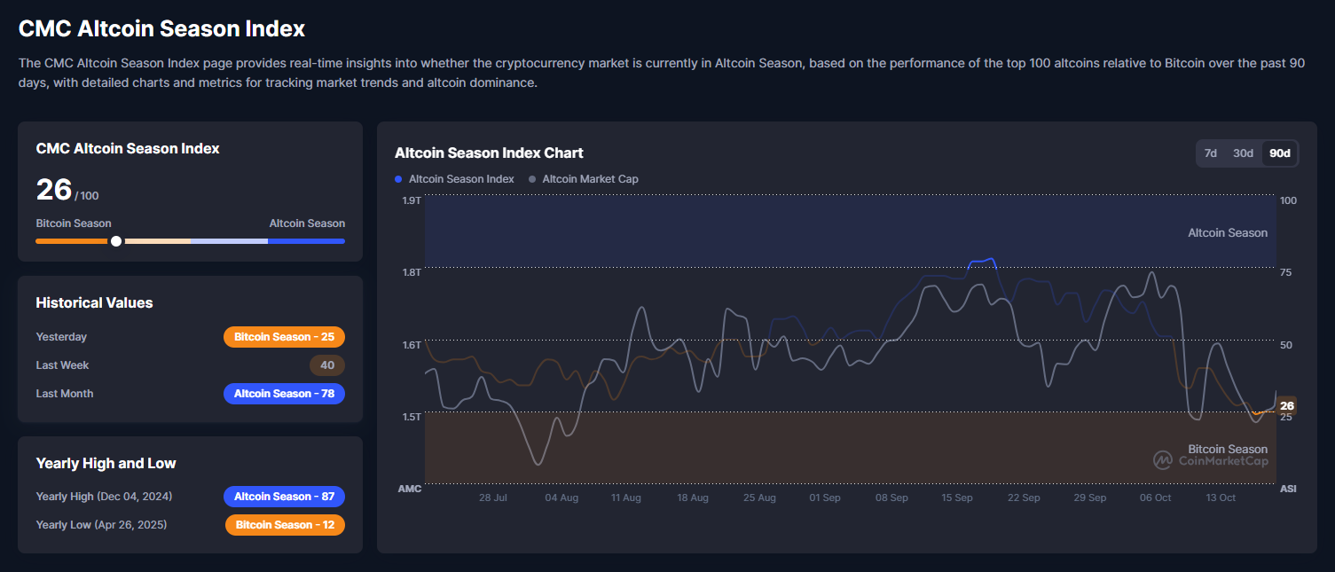 The CMC Altcoin Season Index at 26/100 (Image 3: Altcoin Season Index chart at 26, historical: yesterday 25, last week 40, last month 78) signals Bitcoin season dominance, down from 40, with alt cap contracting. Breaches below 50 mark shifts, but historical lows in October often precede alt rebounds.