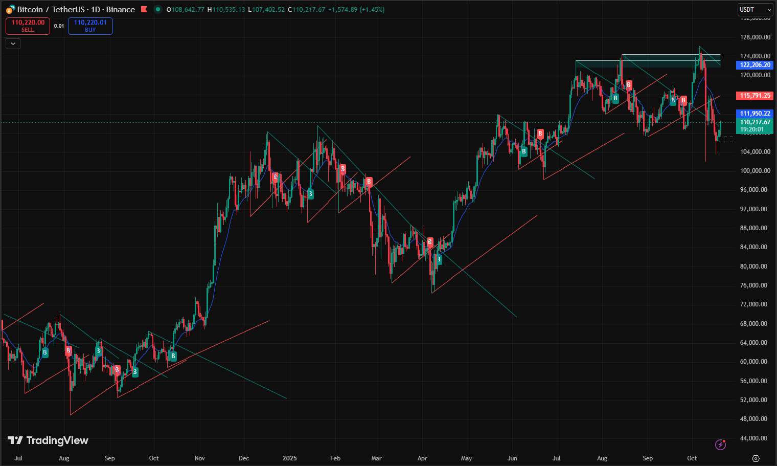 For Bitcoin (BTC/USDT on Binance, Image 4: The daily chart shows Bitcoin trading at $110,642.77, up 1.45%, and still moving inside an ascending channel that has been in place since February 2025. The larger structure remains bullish on higher timeframes, with $104,000 acting as dynamic support during the tariff-driven crash that briefly pushed BTC down to $104,782.88.