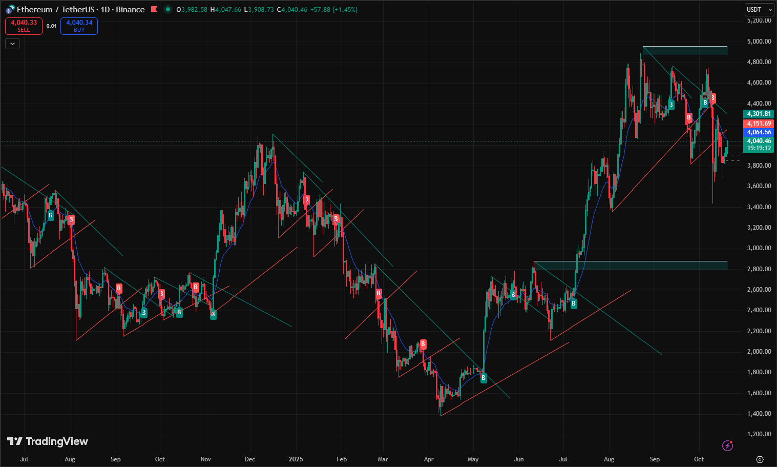 Shifting to Ethereum (ETH/USDT on Binance, Image 5: Daily chart at $4,040.46 +1.45%, in uptrend channel with symmetrical triangle potential). Ethereum is trading at $4,040.46, up 1.45%, moving inside a long-term ascending channel that has guided price action since early 2025. Despite sharp losses during the tariff crash, ETH respected its structural trendline from the June low near $3,200. The rebound from the $3,878 bottom confirmed strong buyer defense and restored short-term confidence.