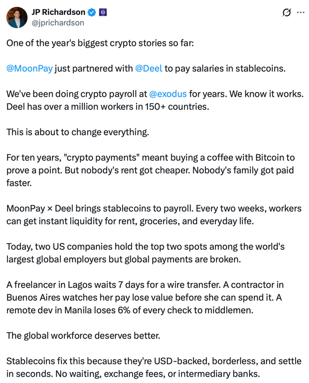 - Stablecoins are moving deeper into real-world payroll and financial infrastructure.
