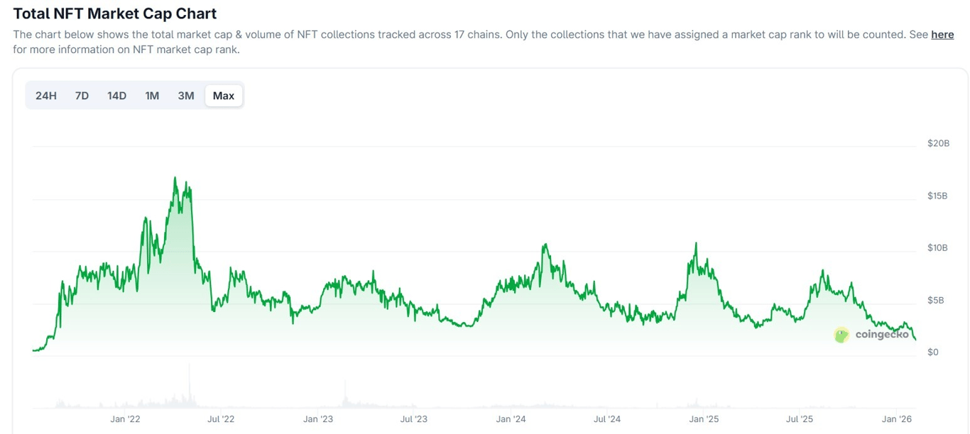 The global NFT sector dropped below $1.5 billion in market capitalization, returning to levels last seen before the 2021 NFT boom. The decline follows broader crypto market weakness and structural challenges within the NFT ecosystem.