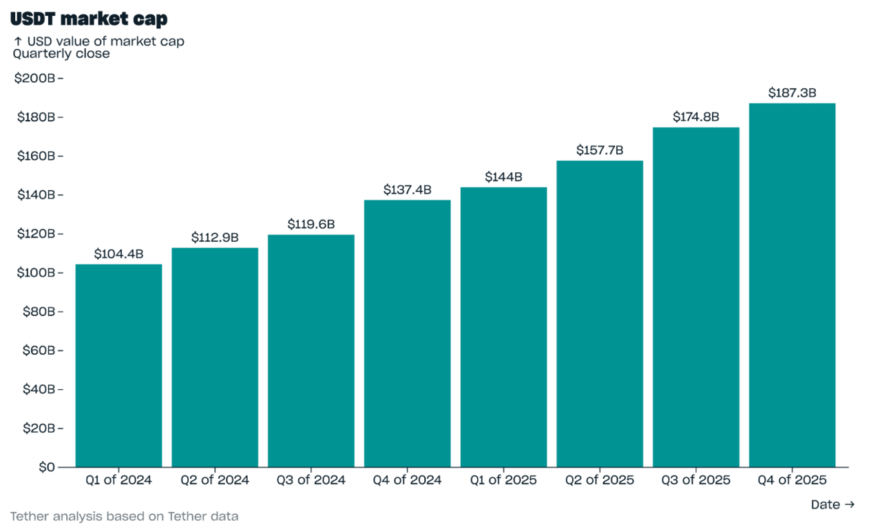 Tether’s USDt stablecoin expanded to a record $187.3 billion market capitalization, adding over $12 billion during Q4 2025 despite broader crypto market weakness.