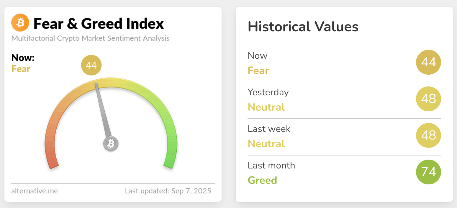 - Market sentiment has shifted into “Fear,” according to the Crypto Fear & Greed Index (score: 44).