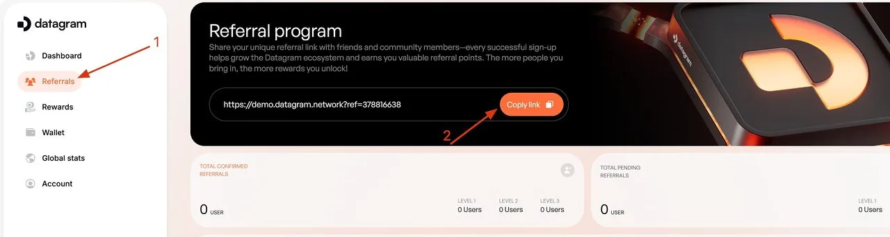 Access the “Referrals” section to obtain your unique referral link. Share this link to invite other users to the platform and earn additional reward points for each successful referral who activates a node.