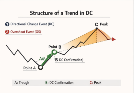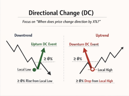Directional Change was introduced by Guillaume et al. (1997) in the context of identifying hidden patterns in the Forex market. If you’ve used the ZigZag indicator before, DC will feel familiar—both aim to filter market noise and keep only meaningful moves.