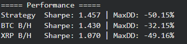 The example below illustrates the full pipeline from DC to HMM to portfolio allocation. We download BTC and XRP data from yfinance, compute Directional Change features (notably RRR), and feed them into an HMM to infer market regimes. Using the inferred regime and DC features, we optimize BTC/XRP portfolio weights and backtest by applying those weights to realized returns to build an equity curve. Finally, we compare the strategy to Buy & Hold using final equity, Sharpe ratio, and maximum drawdown.