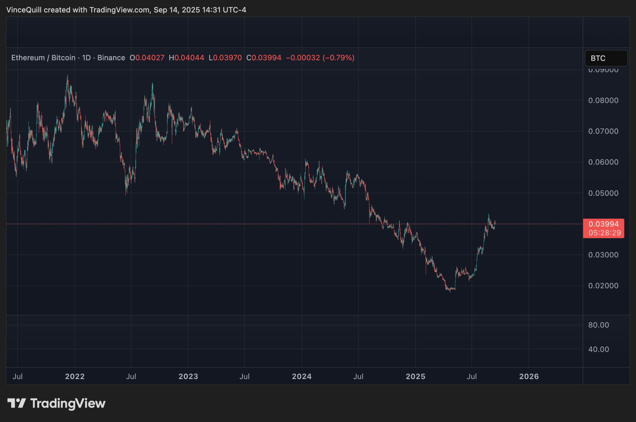 The ETH/BTC ratio from July 2022 to July 2025. Source: TradingView
