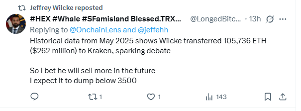 Although sending funds to an exchange does not necessarily imply a sale, this isn’t Wilcke’s first significant transfer. In August, he deposited about $9.2 million worth of ETH to Kraken, and earlier had sent $262 million worth of ETH to the same exchange. At the time, Lookonchain suggested those earlier transfers were likely internal — possibly redistributing assets to new wallets rather than liquidating them.