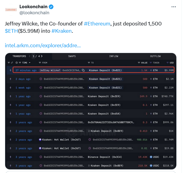 Ethereum co-founder Jeffrey Wilcke has transferred approximately 1,500 ETH — valued around $6 million — to the crypto exchange Kraken, according to on-chain analytics firm Lookonchain. The move came as Ether’s price slid from $4,000 to roughly $3,900, fueling market speculation that Wilcke may be preparing to sell a portion of his holdings.
