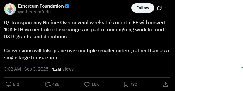 In an announcement on X, the Ethereum Foundation said it will convert 10,000 ETH this month using centralized exchanges, executed in smaller transactions rather than a single block trade. The foundation framed the sale as routine, pointing to its treasury policy that calls for periodic ETH conversions to cover fiat costs for ecosystem research, development, and grants.