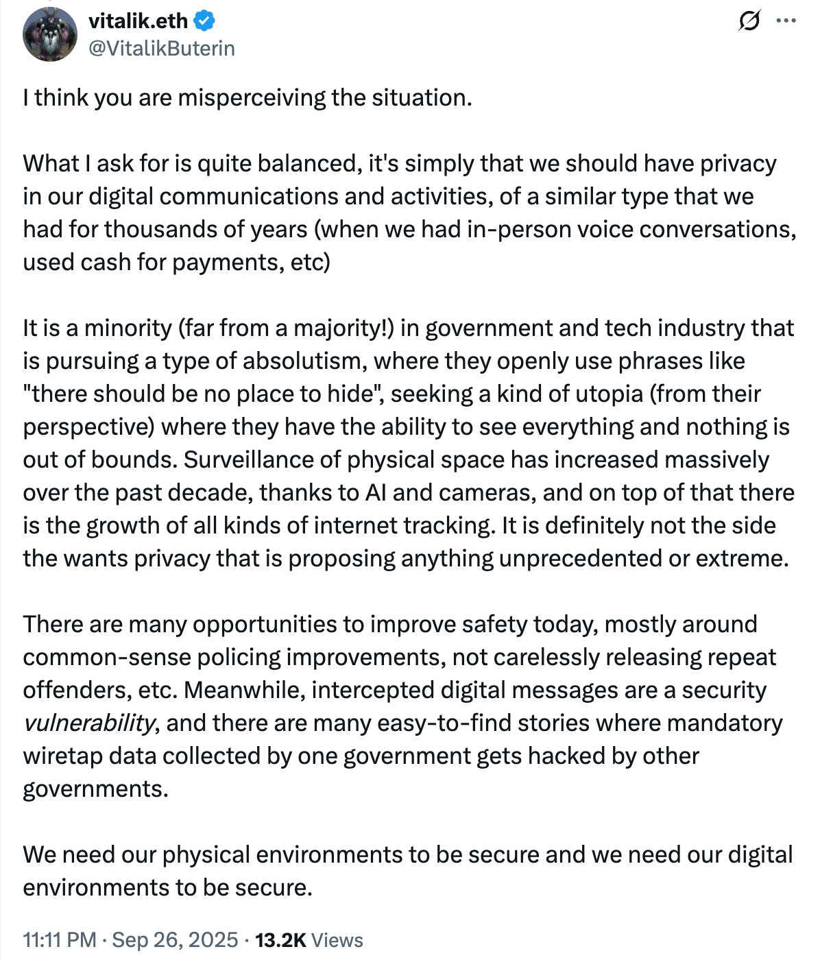 “You cannot make society secure by making people insecure,” Buterin warned, adding, “We all deserve privacy and security, without inevitably hackable backdoors, for our private communications.”