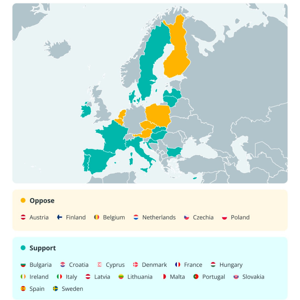 On the legislative front, 15 EU member states support the proposal, but that is not enough: under EU rules, a qualified majority (65% of the EU population) is required. Germany holds a key position; if it votes in favour, the law is likely to pass; if it opposes or abstains, the proposal may fail.