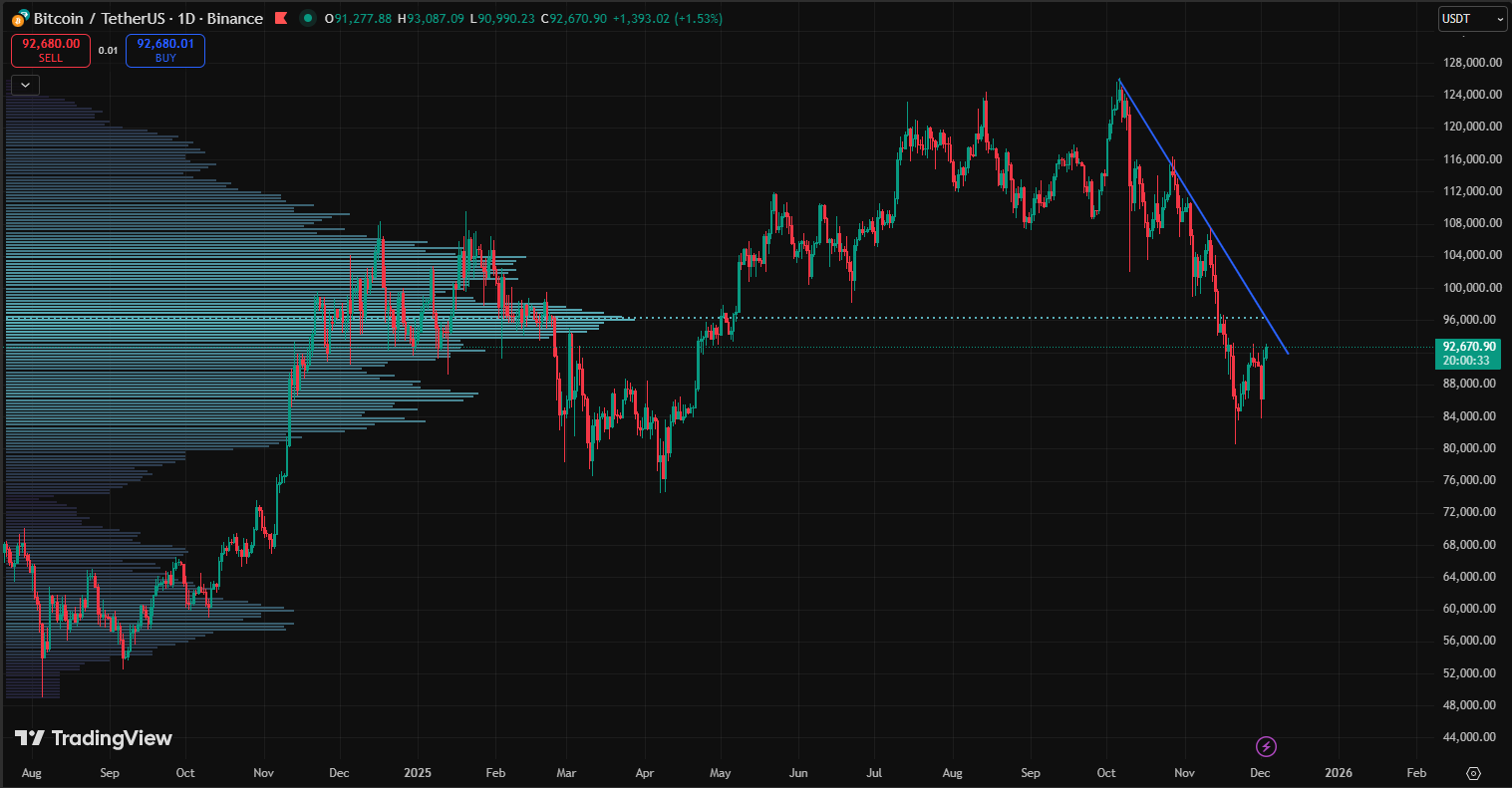 Momentum now pushes Bitcoin into one of the most important regions on the chart. A massive High Volume Node sits around $96,000, carrying years of trading memory and thick layers of overhead supply. It’s the heaviest liquidity barrier in the current range, and it converges with the long-term descending trendline drawn from the all-time high. This is the battlefield.