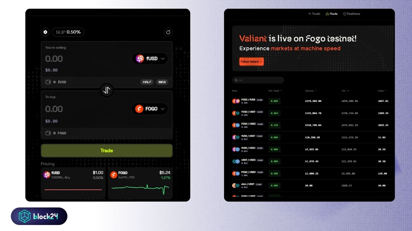 - Valiant (valiant.trade): Perform token swaps and provide liquidity for the FOGO/fUSD pair in the Pools section.