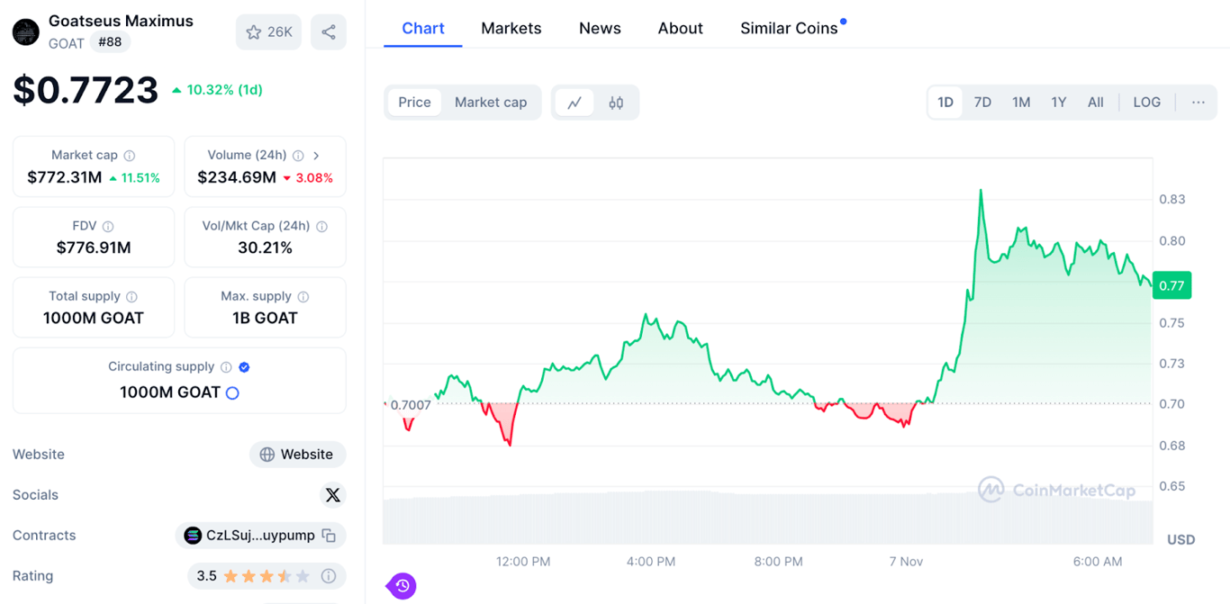 In October, the story grew even wilder. An anonymous developer released Goatseus Maximus (GOAT) on Solana. After Ayrey confirmed Truth Terminal supported the token, trading volume exploded. Within a week, GOAT’s value passed $1 billion, turning the chatbot into the first digital entity with its own fortune and setting off a rush to build similar systems.