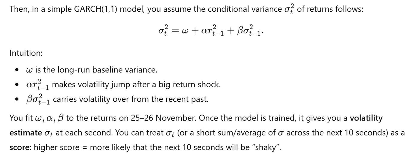 You can think of GARCH (Generalized Autoregressive Conditional Heteroskedasticity) as a way to model how volatility clusters in time. It doesn’t try to predict direction; it tries to answer: “how wild is the next move likely to be, given recent behavior?”
