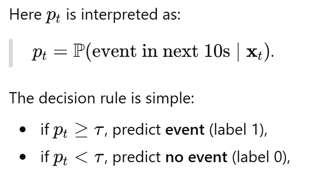 After filtering out all the stale parts using gap_len and then assigning labels, the 25–26 November window ends up with about 172k one-second samples, with roughly 4% labeled as events. That’s rare enough to be difficult, but not so rare that everything becomes hopeless.