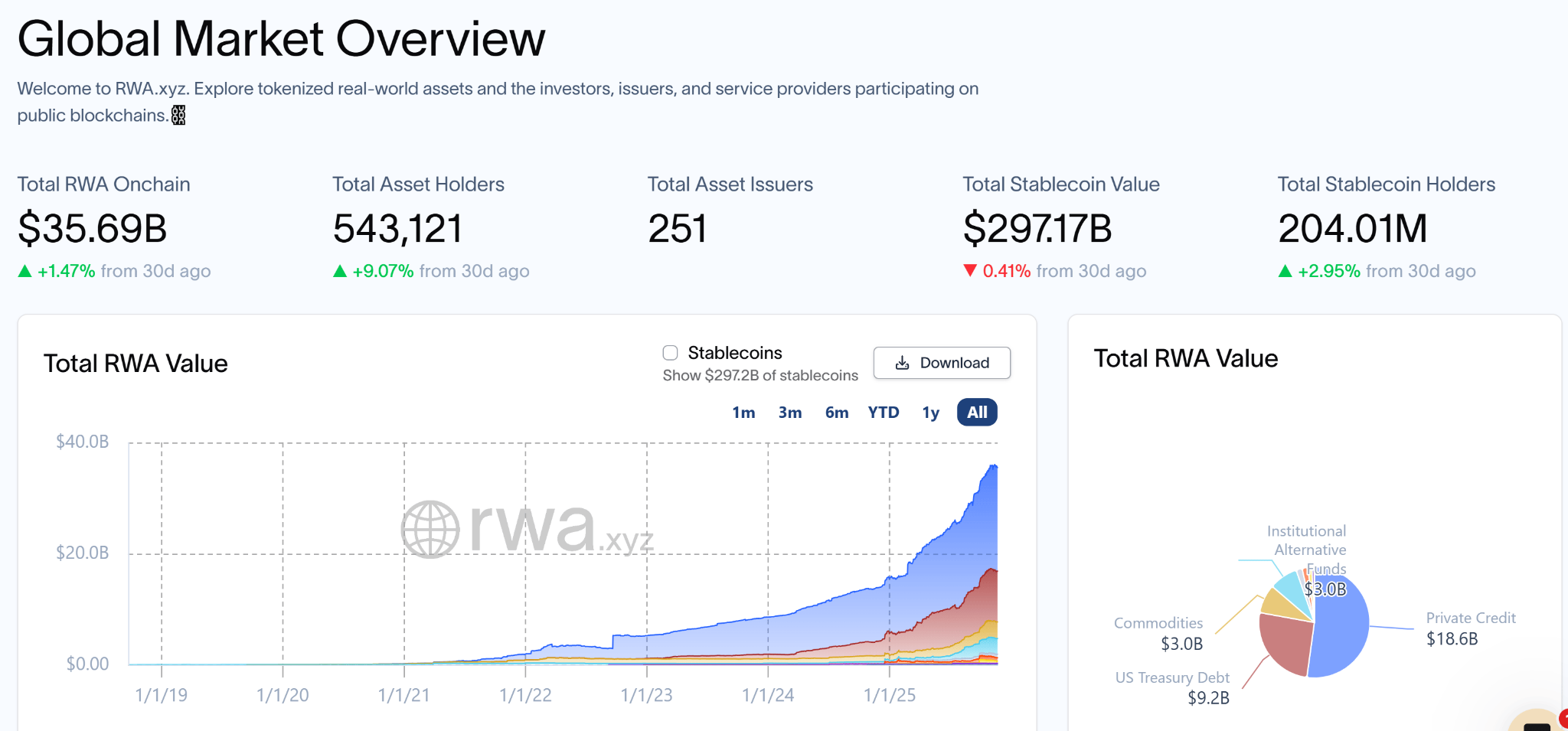 • Tokenized asset market grows from $5B to $35.6B since early 2023