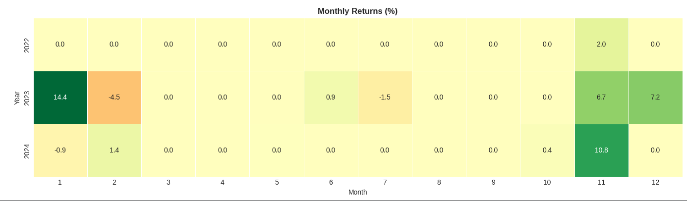 After months of sideways movement (represented by 0.0s and minor fluctuations), the strategy delivered a strong performance in November 2024 (+10.8%), coinciding with the post-election market euphoria.