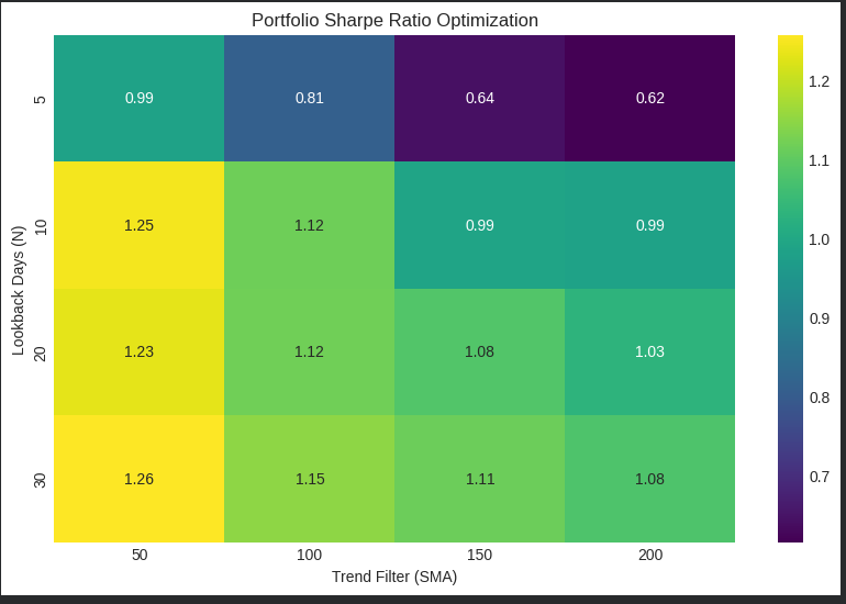 Before analyzing performance, we conducted a Grid Search across 16 parameter combinations to identify the most robust configuration. The goal was to maximize the Sharpe Ratio (Risk-Adjusted Return).