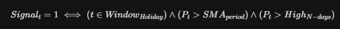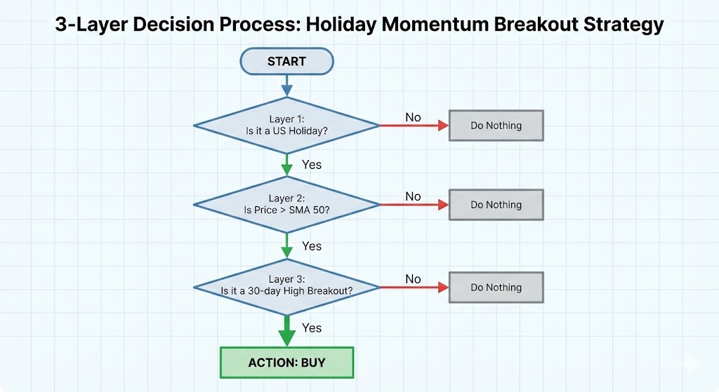 The Holiday Momentum Breakout Strategy uses a strict combination of filters to validate trend strength. A position is triggered only when all conditions confirm alignment: