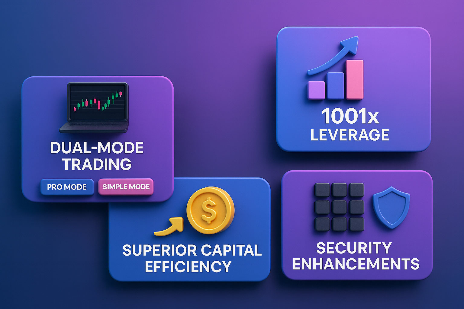 - Dual-Mode Trading: The platform caters to two audiences. Pro Mode offers a full-featured CLOB (Central Limit Order Book) system tailored for professional traders. Simple Mode delivers one-click trading, MEV protection, and up to 1001x leverage, opening the market to retail users and newcomers. This dual structure widens adoption and allows both experience levels to coexist on one platform.