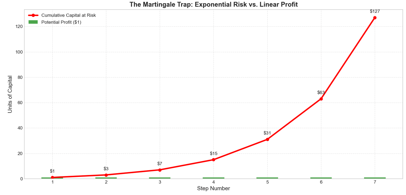A trader’s capital is finite, and drawdowns are not patient. Each loss forces position size to grow, and that growth is exponential. The catch is brutal. Your profit target stays small and linear, but the risk you must carry to reach it expands at an accelerating rate. That mismatch is where the strategy collapses.