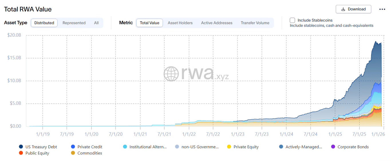 The RWA market has seen growing institutional adoption. In early 2025, on-chain tokenized RWAs totaled around $5.5 billion, then reportedly grew to roughly $18.6 billion over the course of the year. Major financial institutions such as BlackRock, Franklin Templeton, and JPMorgan have launched tokenized funds, with Ethereum hosting a large share of tokenized assets and remaining a leading chain for RWA activity.
