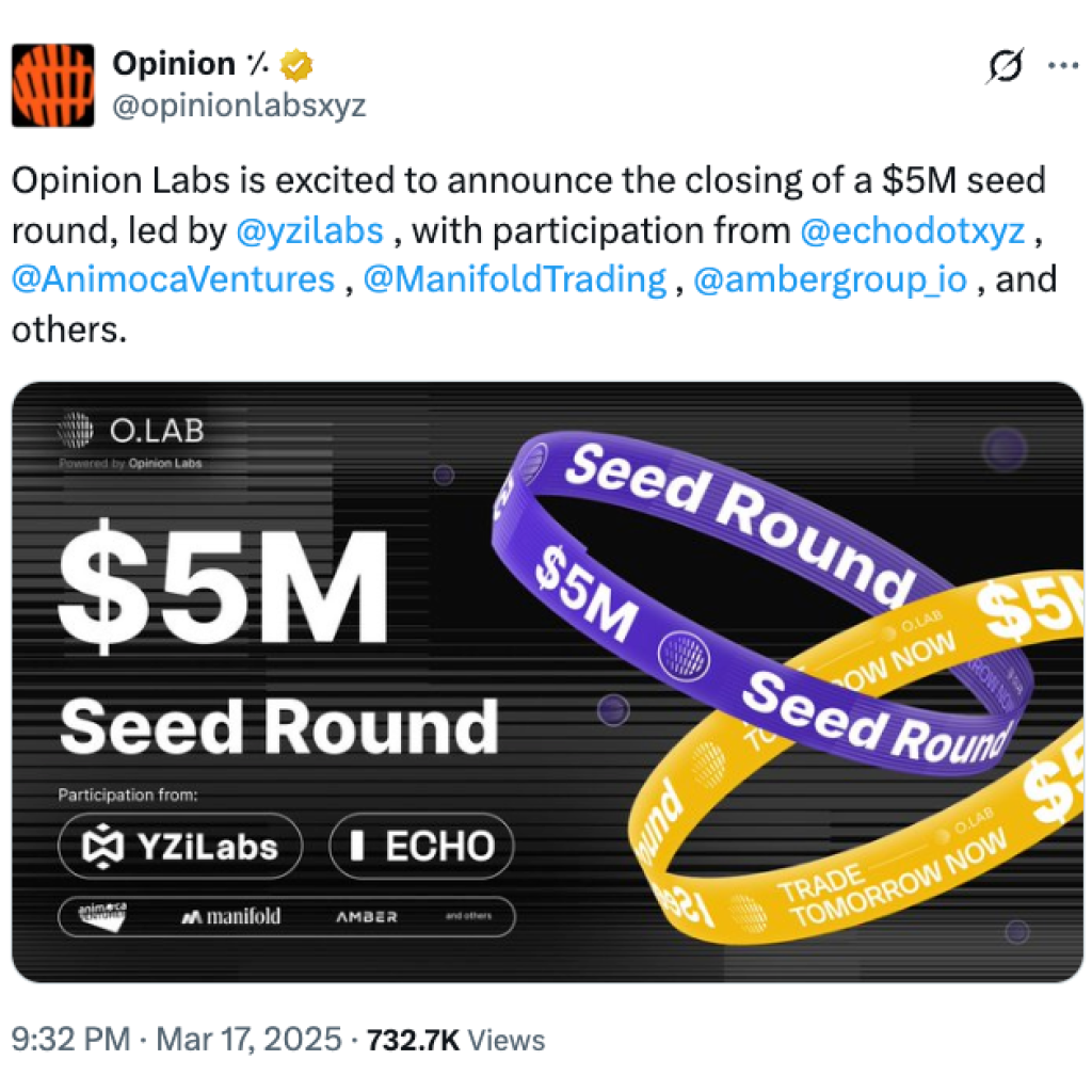 The announcement follows a breakout performance from Opinion, another YZi-backed prediction platform that has stunned industry observers by surpassing established competitors within weeks of going live. Opinion Labs, the platform’s developer, secured $5 million in seed funding in March 2025 led by YZi (formerly Binance Labs), with participation from Animoca Ventures, Manifold Trading, Amber Group and others.