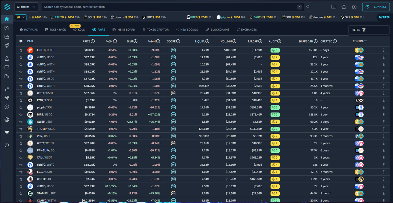 DEXTools makes this anatomy readable at a glance because its market views surface liquidity, volume, swaps, and pair age side by side, so anchor candidates stand out early and satellites reveal their role through behavior. With that context, market selection becomes an environmental decision first, and a single-pair decision second.