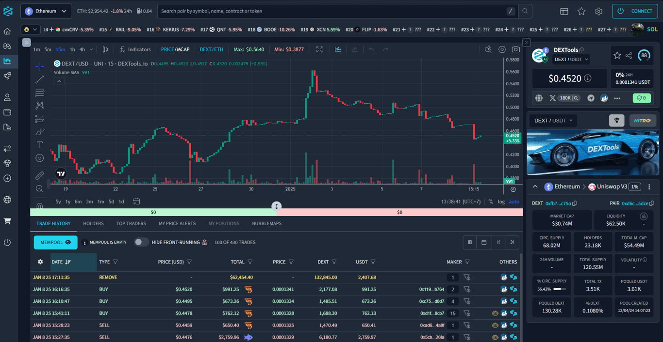 From there, DEXTools carries environmental context directly into execution, so market structure remains visible while trades take place. Liquidity panels show how much usable depth sits near spot, while swap feeds reveal how size actually clears under live conditions. Trade history and mempool views then add another layer by showing whether flow persists and builds pressure or simply passes through without commitment. Wallet intelligence completes the picture by framing participation, helping you separate accumulation-driven activity from extraction-driven movement. Together, these views answer the execution questions that matter most: where liquidity commits, how flow behaves under size, and whether participation repeats long enough for a pool to function like a market.