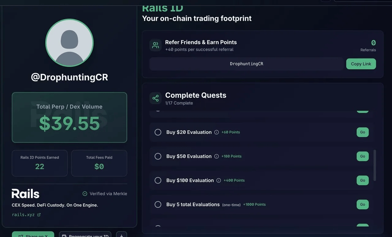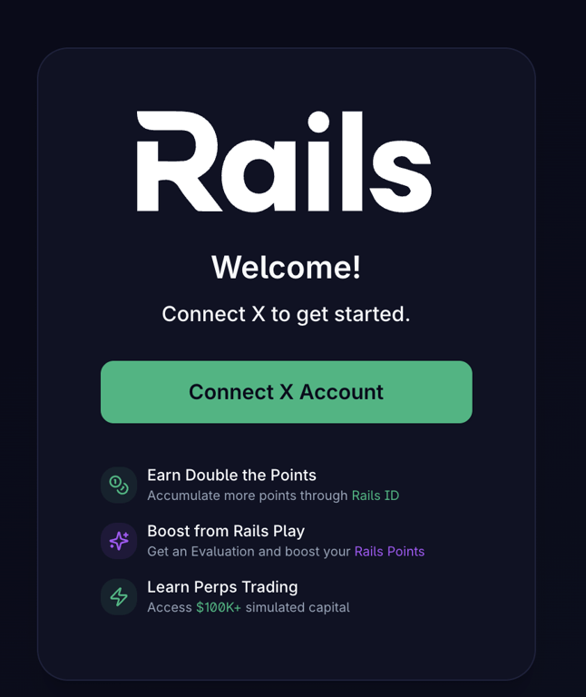 Connect a compatible wallet, follow Rails on X, and generate your participation card to begin accumulating points.