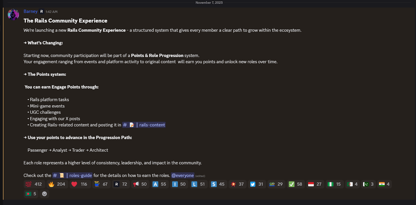 Rails' airdrop campaign through the Rails Pass program represents a community-focused token distribution strategy, allocating 40% of supply to early participants without requiring initial capital investment. The program combines platform engagement, social activities, and trading interactions to build an active user base for the hybrid perpetual DEX ahead of its December TGE, offering the community an opportunity to earn rewards while experiencing a platform designed to merge centralized exchange performance with decentralized custody and transparency.