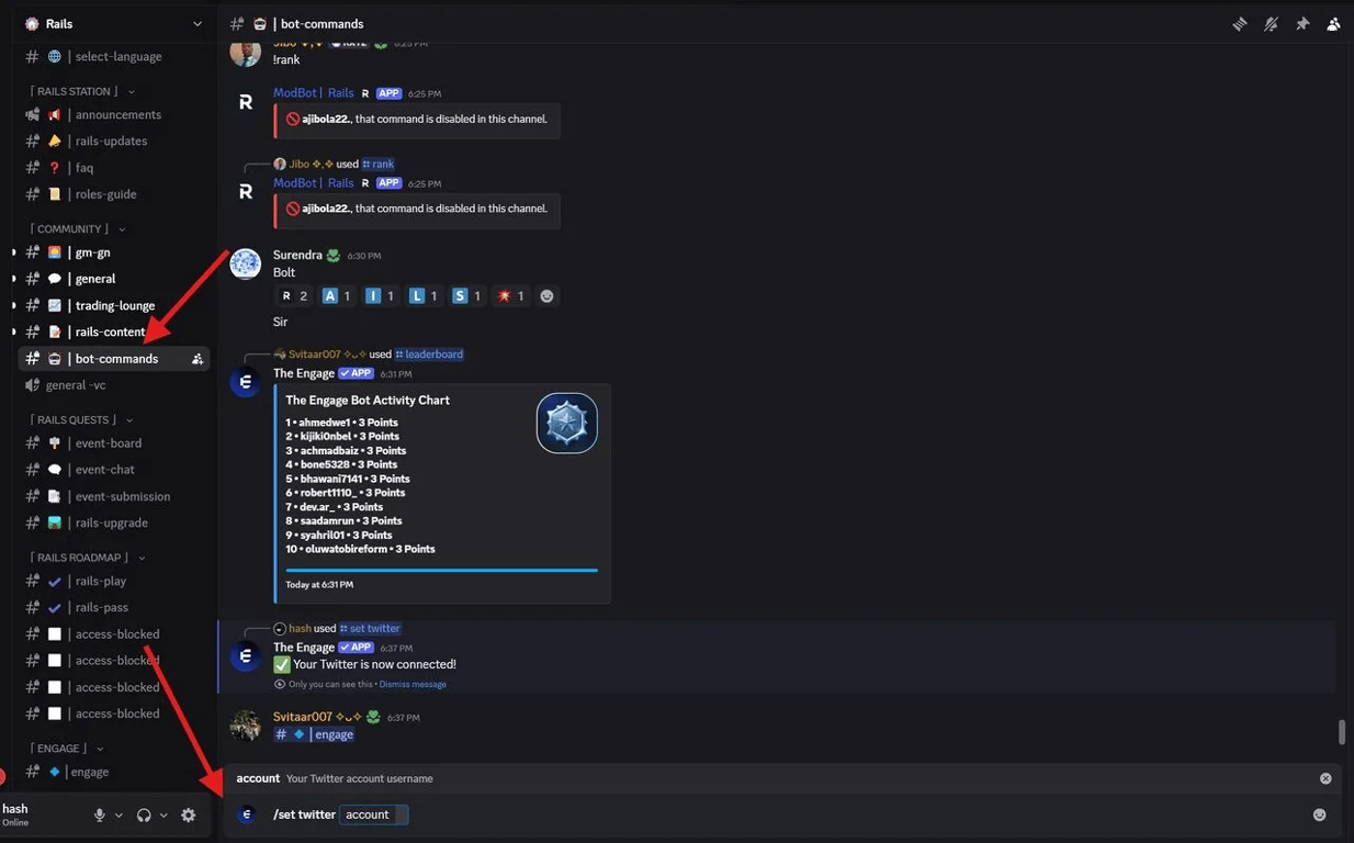 Navigate to the bot-commands channel and enter the command "/set twitter" followed by your username. This allows the bot to track all your activity statistics.