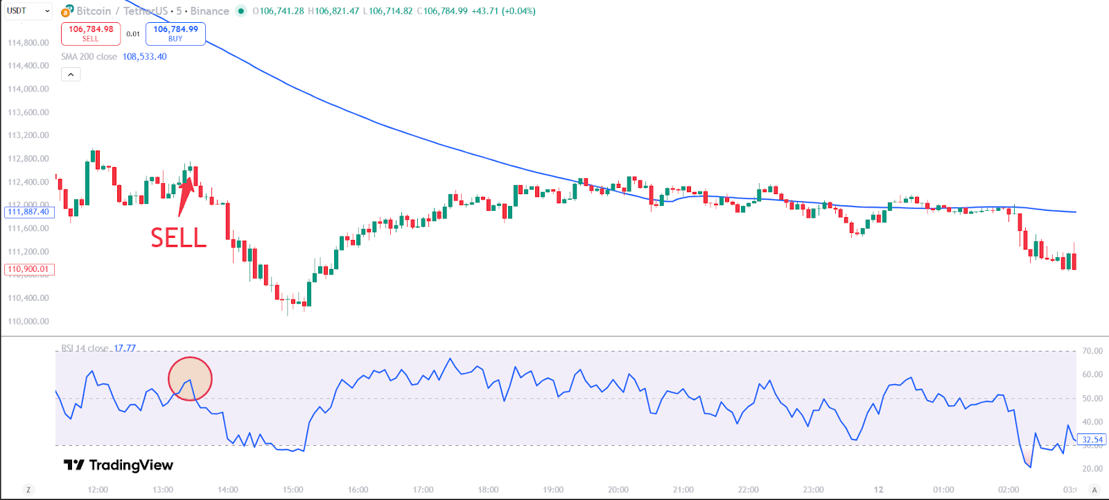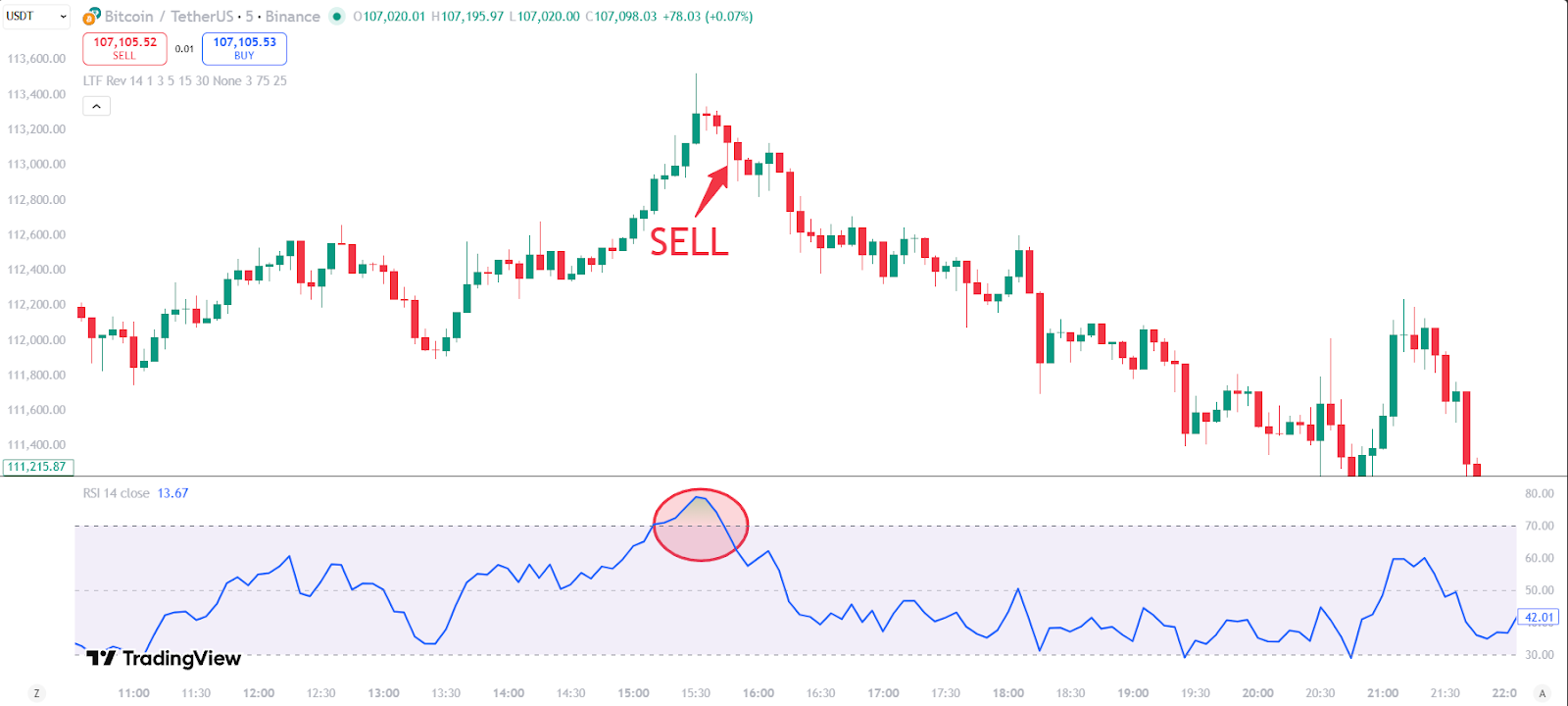 – Sell Order: Wait for RSI to rise above 70, then cross back below it. The move signals fading strength and potential downside pressure.
