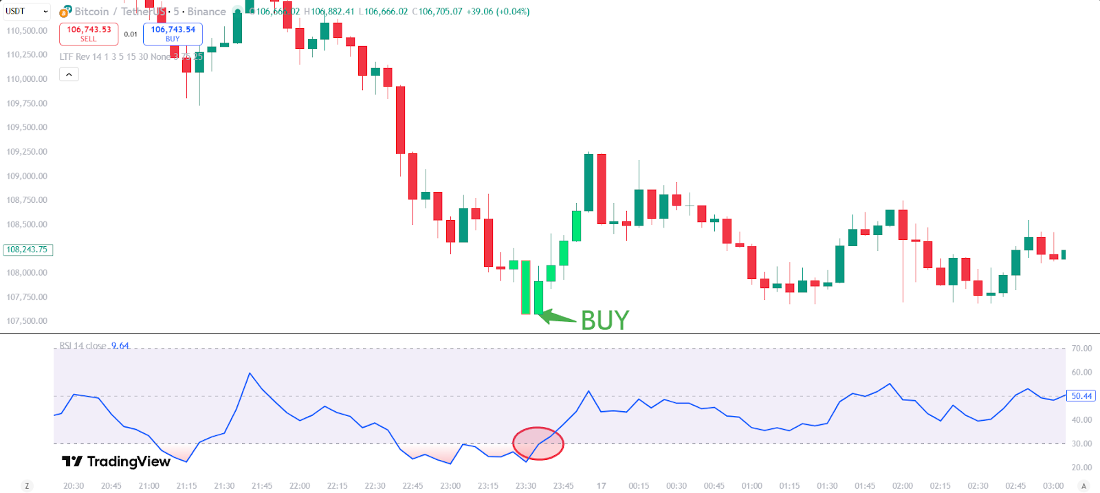 – Buy Order: Wait for RSI to fall below 30, then cross back above it. Confirm the signal when the candle closes, it shows renewed buying momentum.