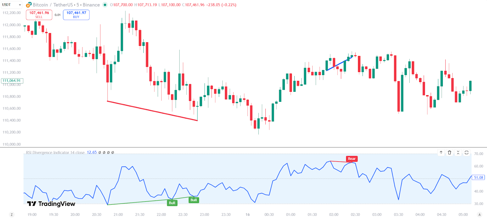 - Bullish divergence: Price makes a lower low while RSI forms a higher low → signals growing buying strength.
